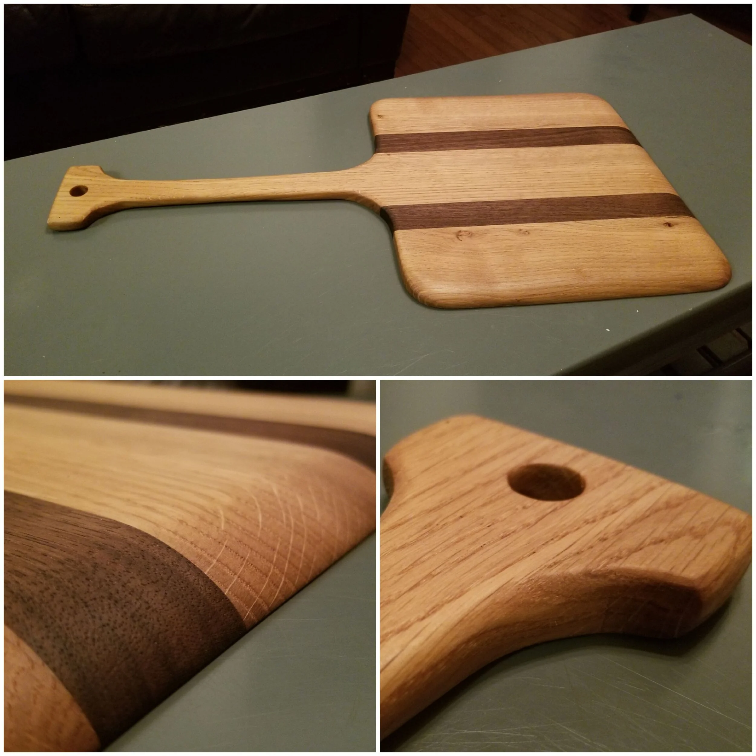 White Oak and Black Walnut, with hand sculpted falling edge. Finished with food safe mineral oil and bees wax conditioner.